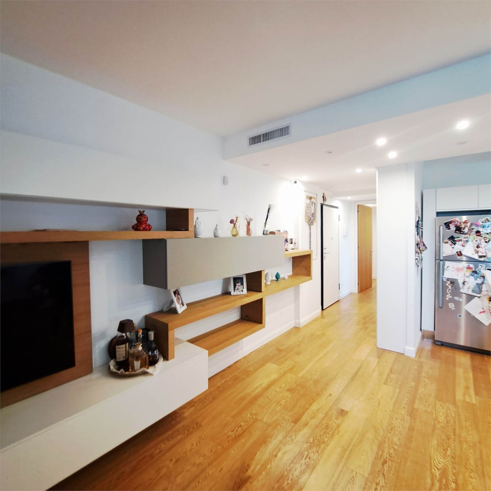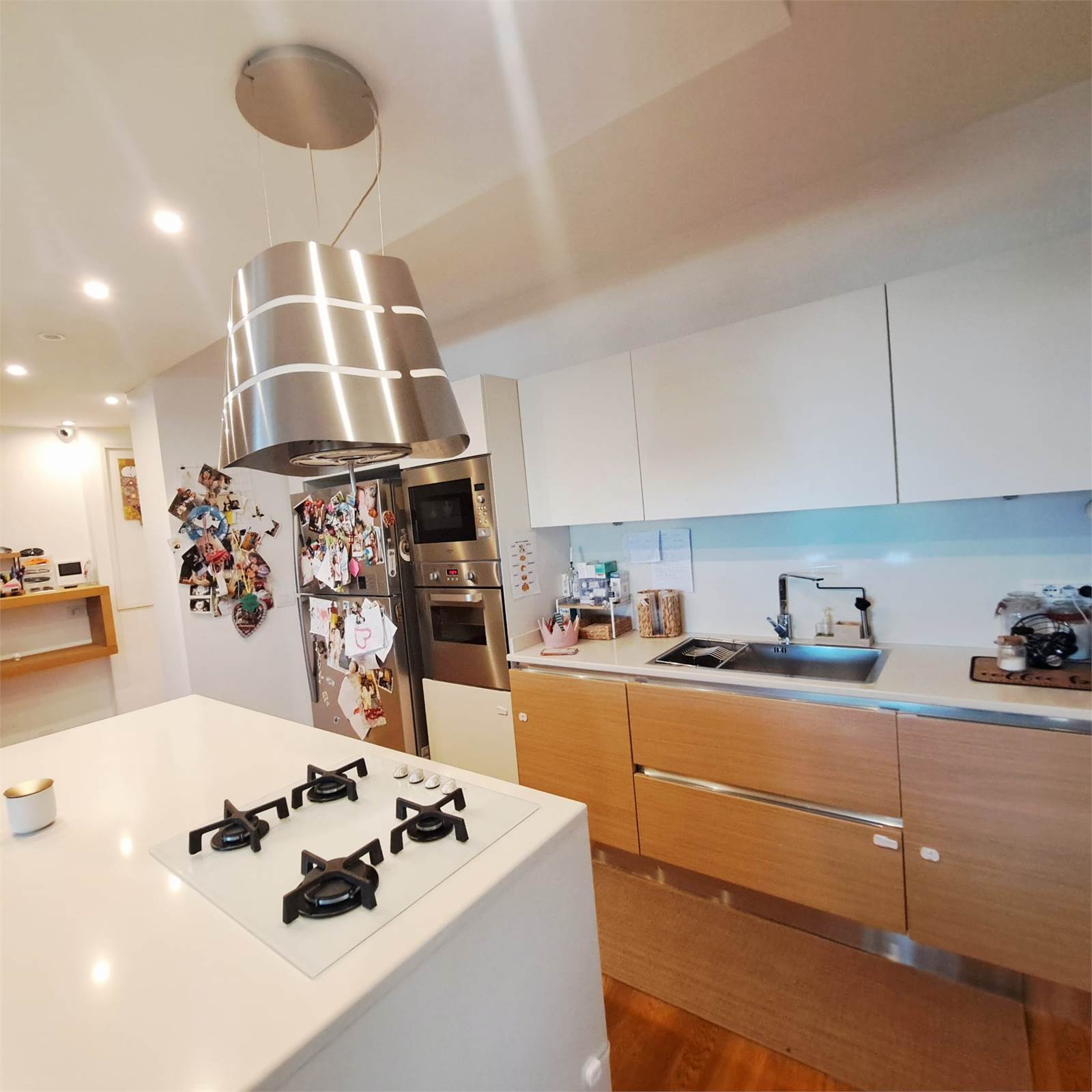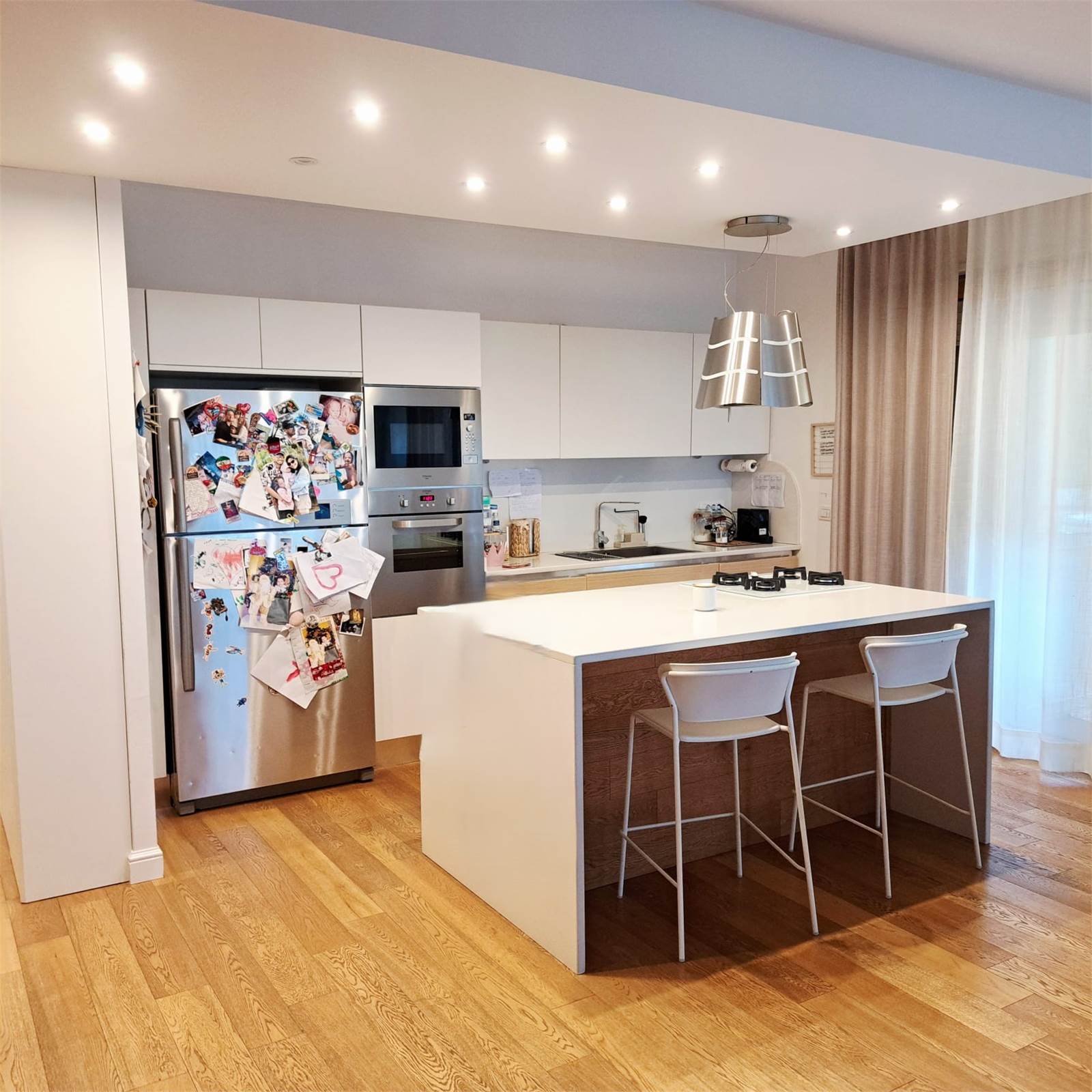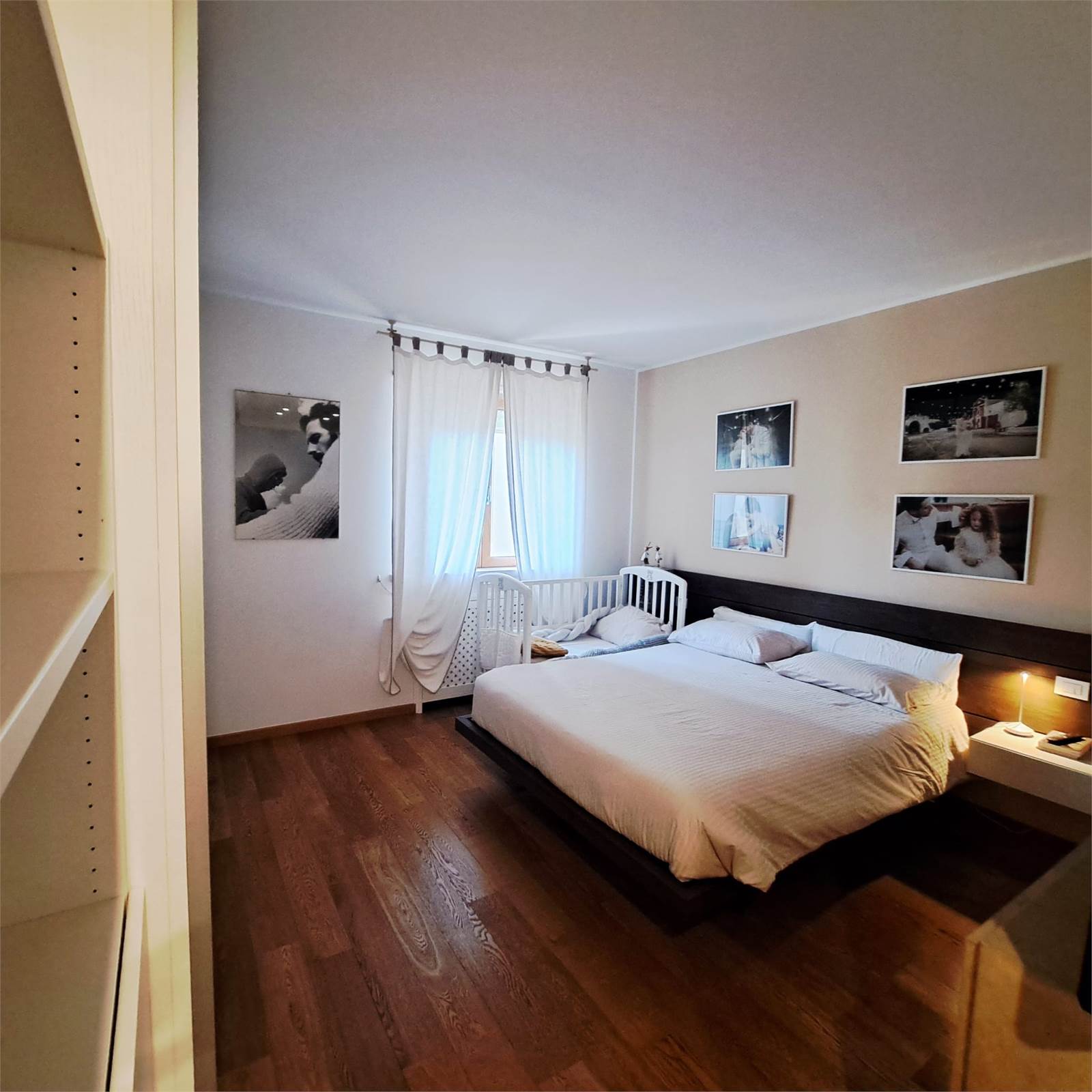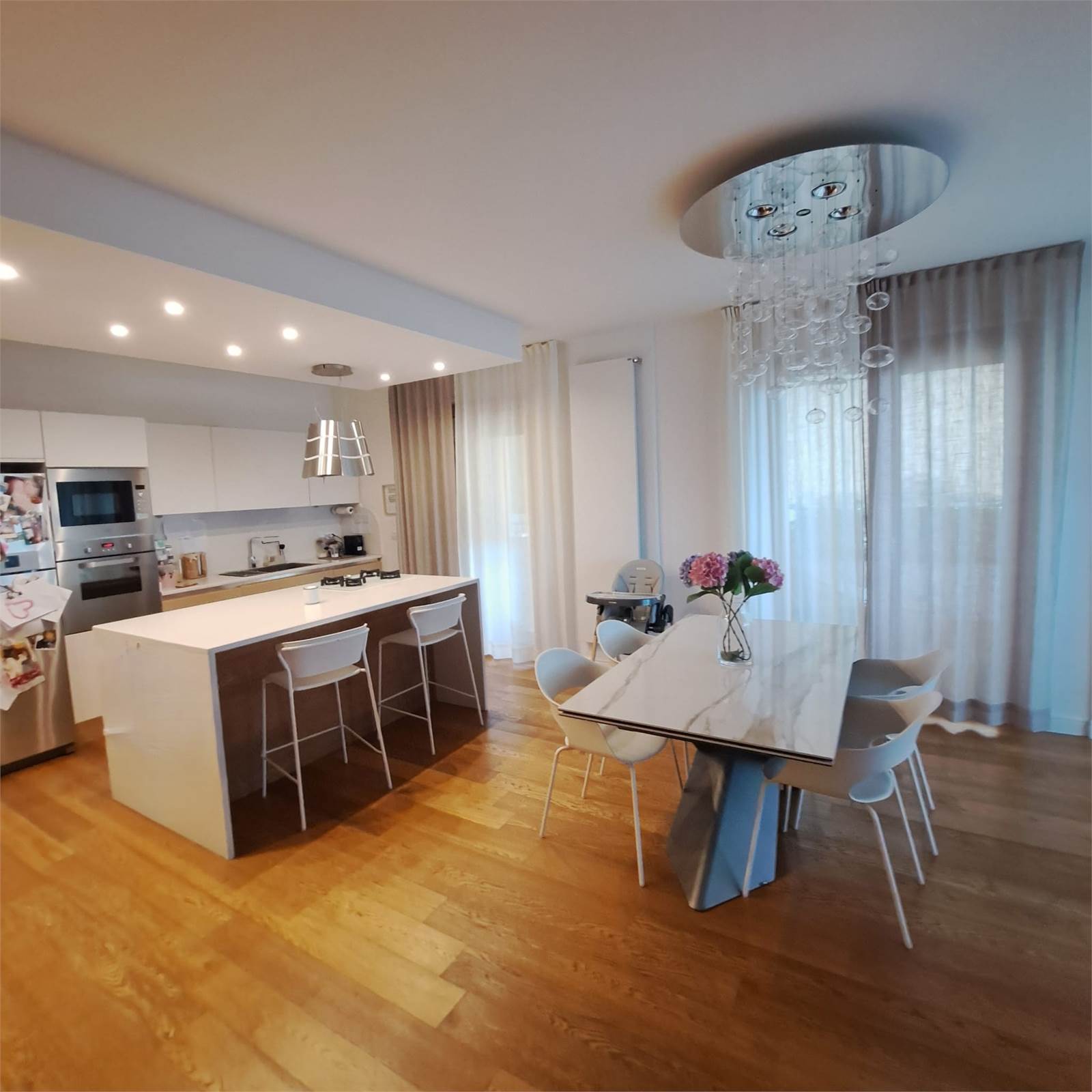 L’abitazione si apre su uno spazioso e luminosissimo salone doppio con cucina open space con doppio accesso al balcone. Un corridoio con arredi fissi su misura conduce alla zona notte, composta da camera matrimoniale con bagno privato e box doccia, una comoda camera per ragazzi e un bagno padronale.