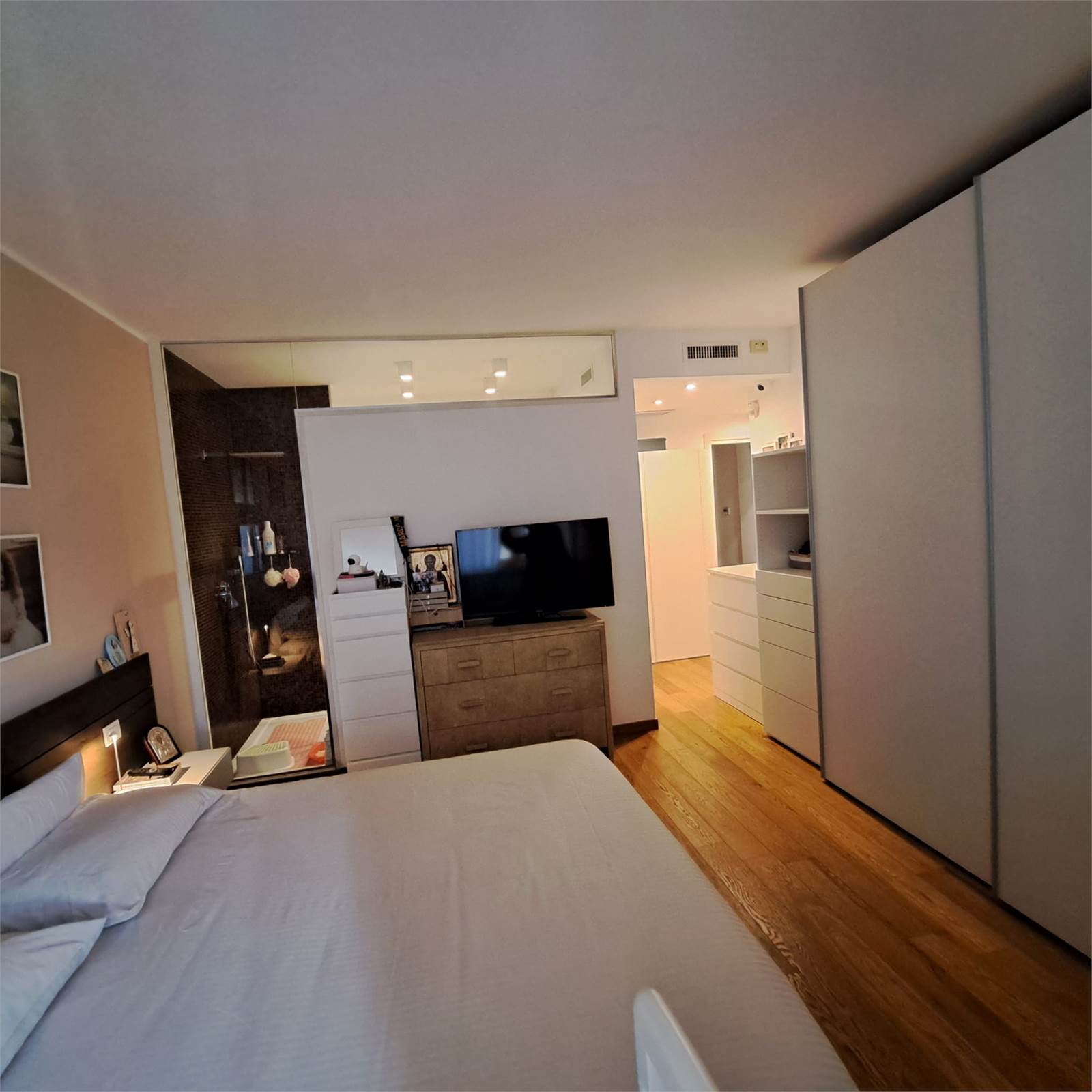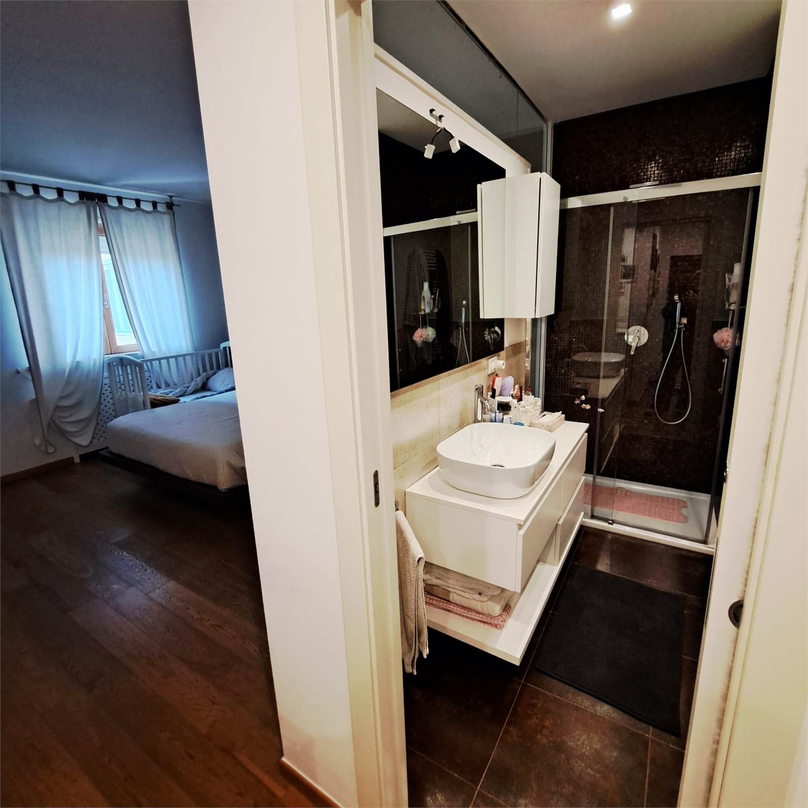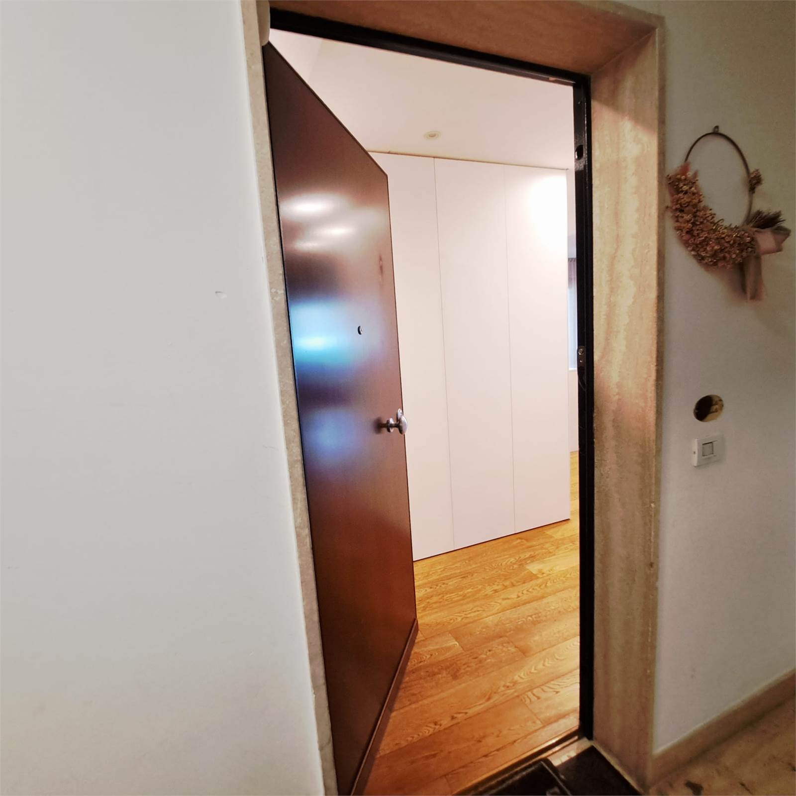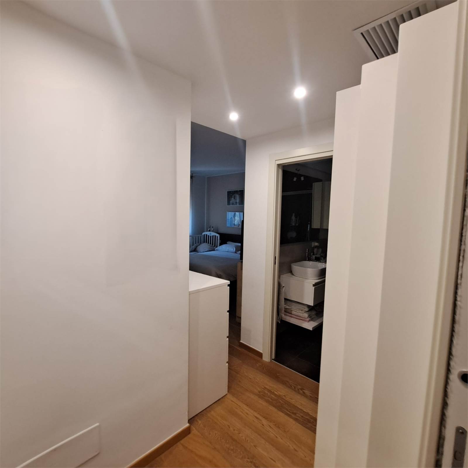 L’abitazione si apre su uno spazioso e luminosissimo salone doppio con cucina open space con doppio accesso al balcone. Un corridoio con arredi fissi su misura conduce alla zona notte, composta da camera matrimoniale con bagno privato e box doccia, una comoda camera per ragazzi e un bagno padronale.