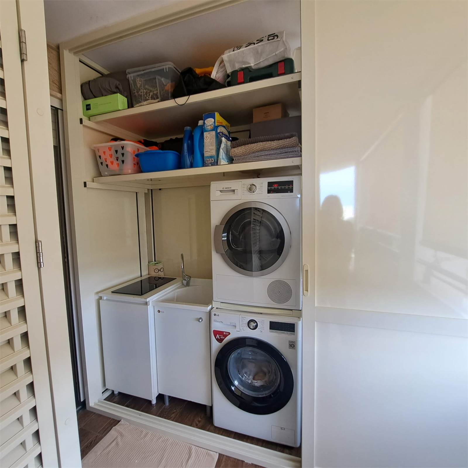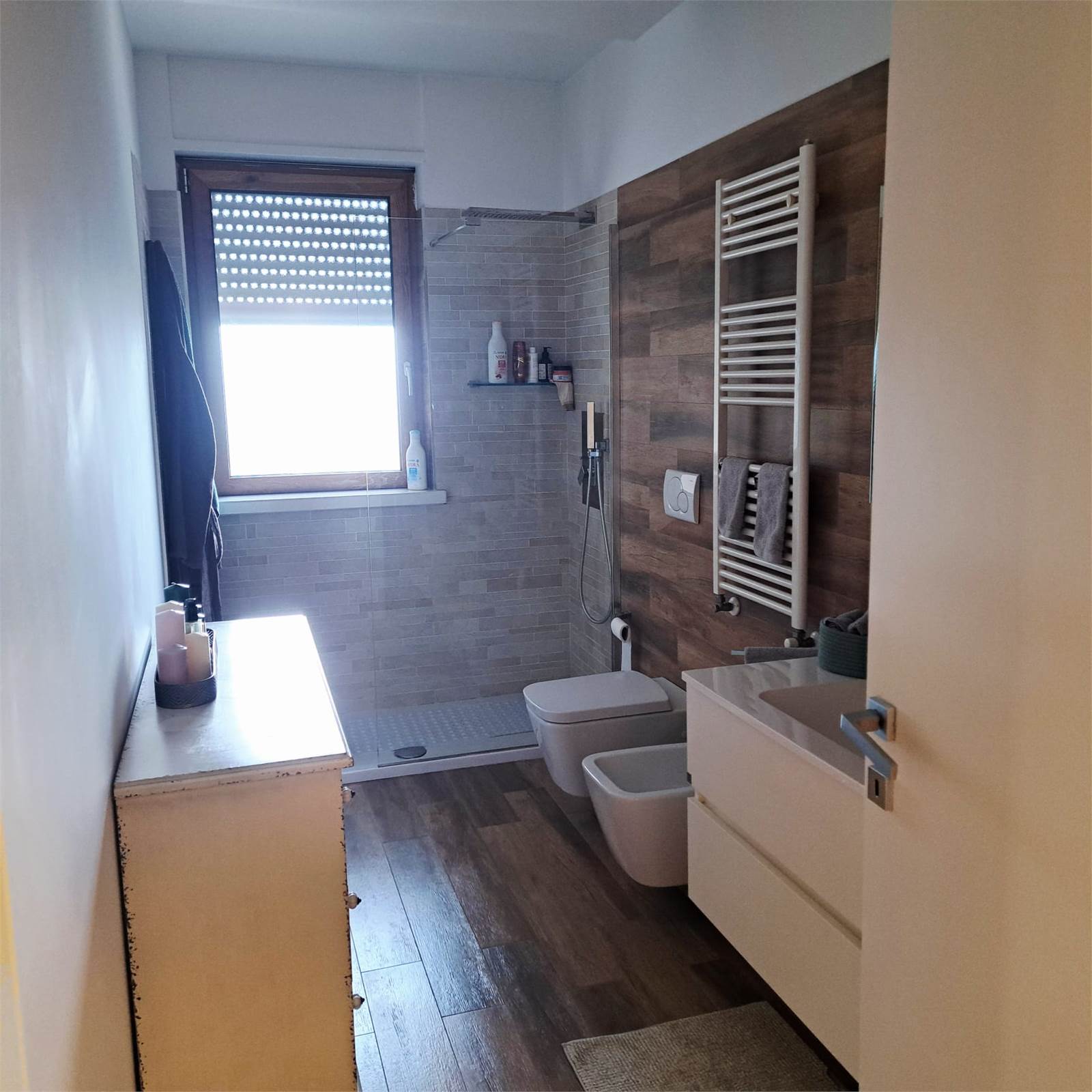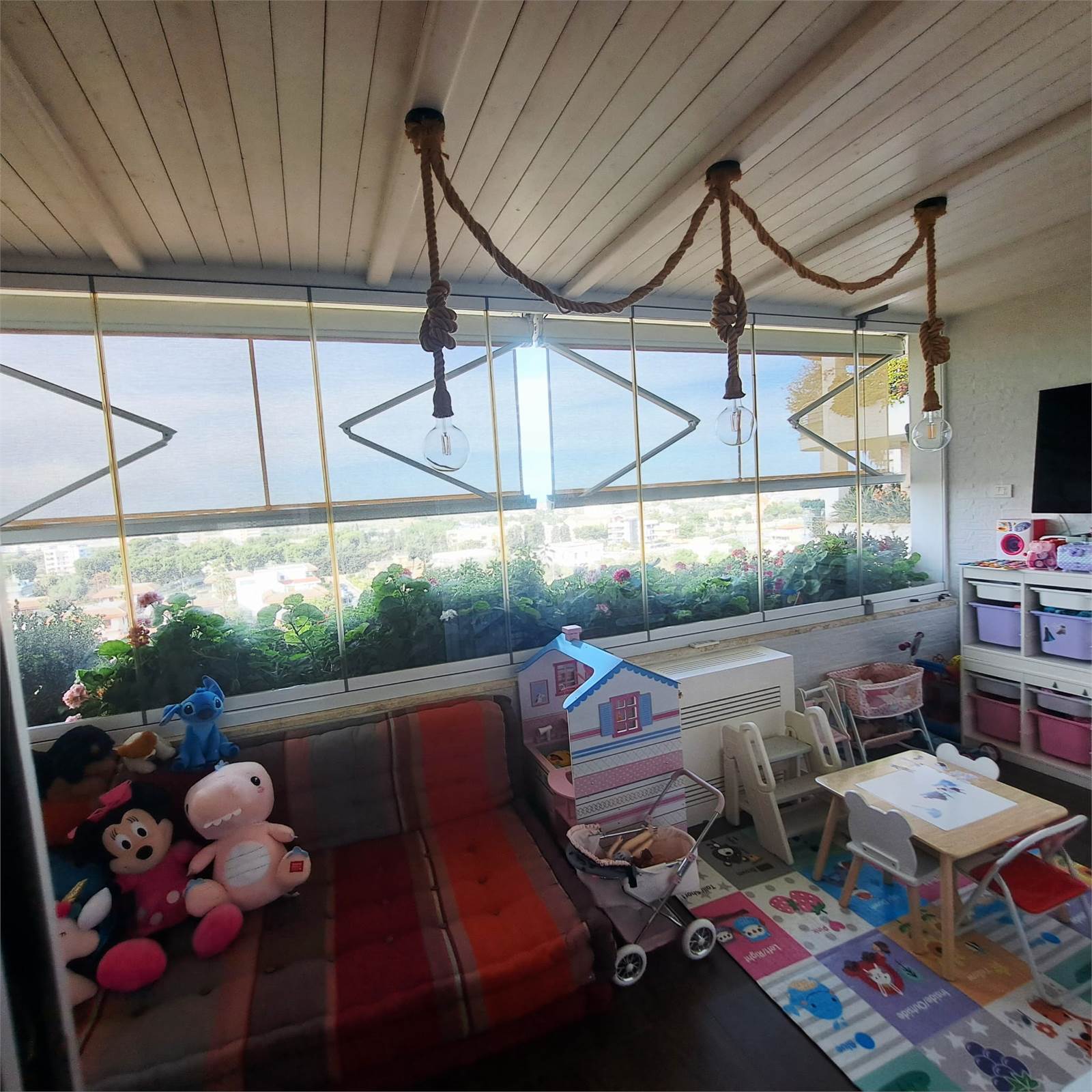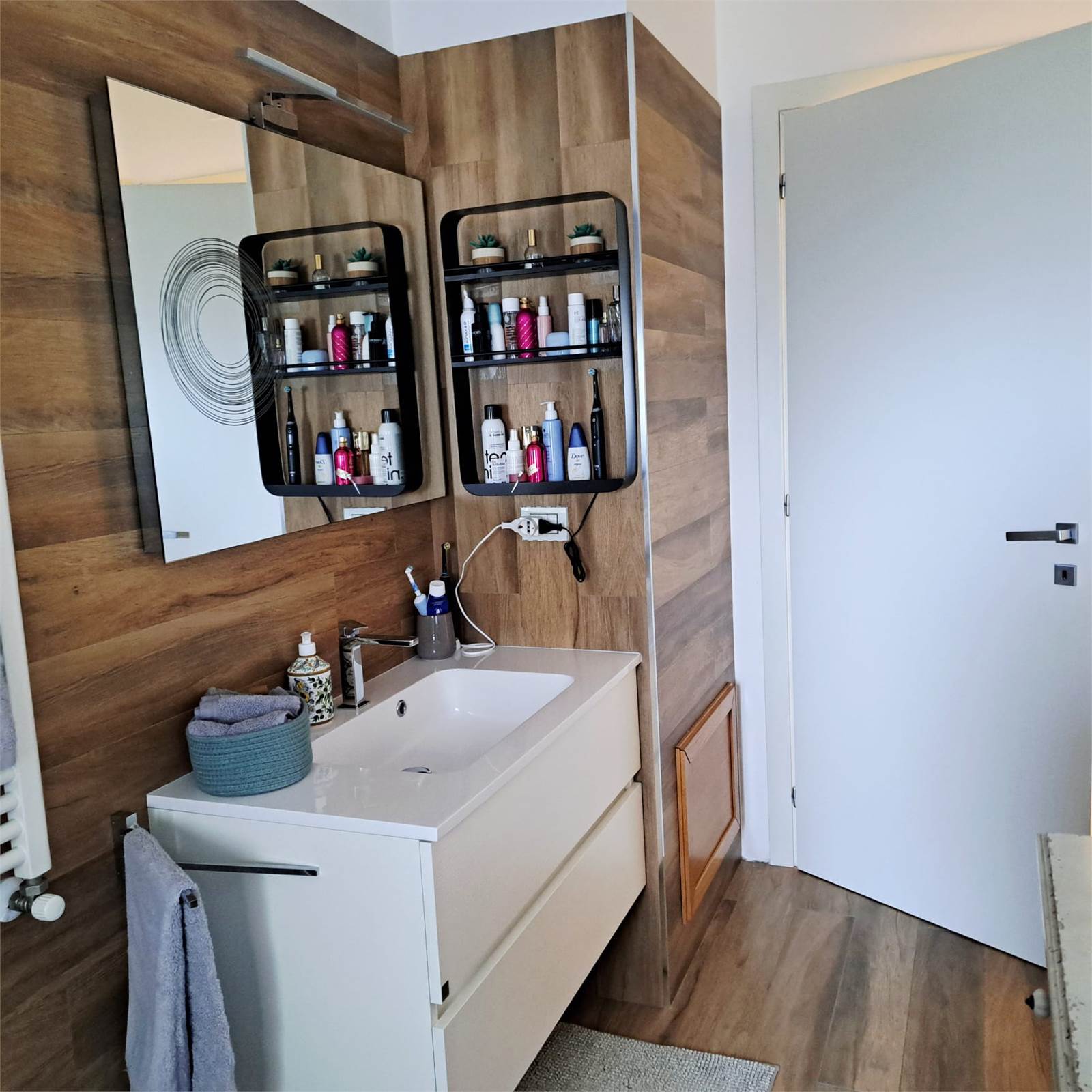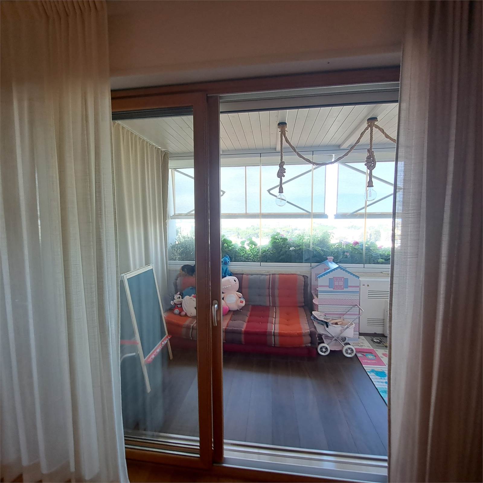 L’abitazione si apre su uno spazioso e luminosissimo salone doppio con cucina open space con doppio accesso al balcone. Un corridoio con arredi fissi su misura conduce alla zona notte, composta da camera matrimoniale con bagno privato e box doccia, una comoda camera per ragazzi e un bagno padronale.